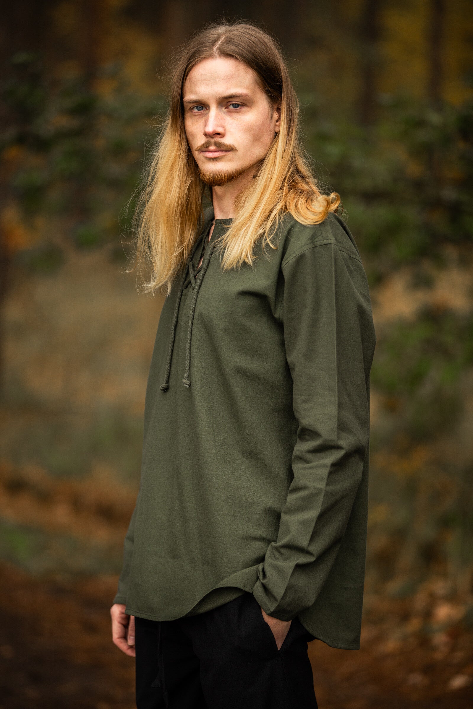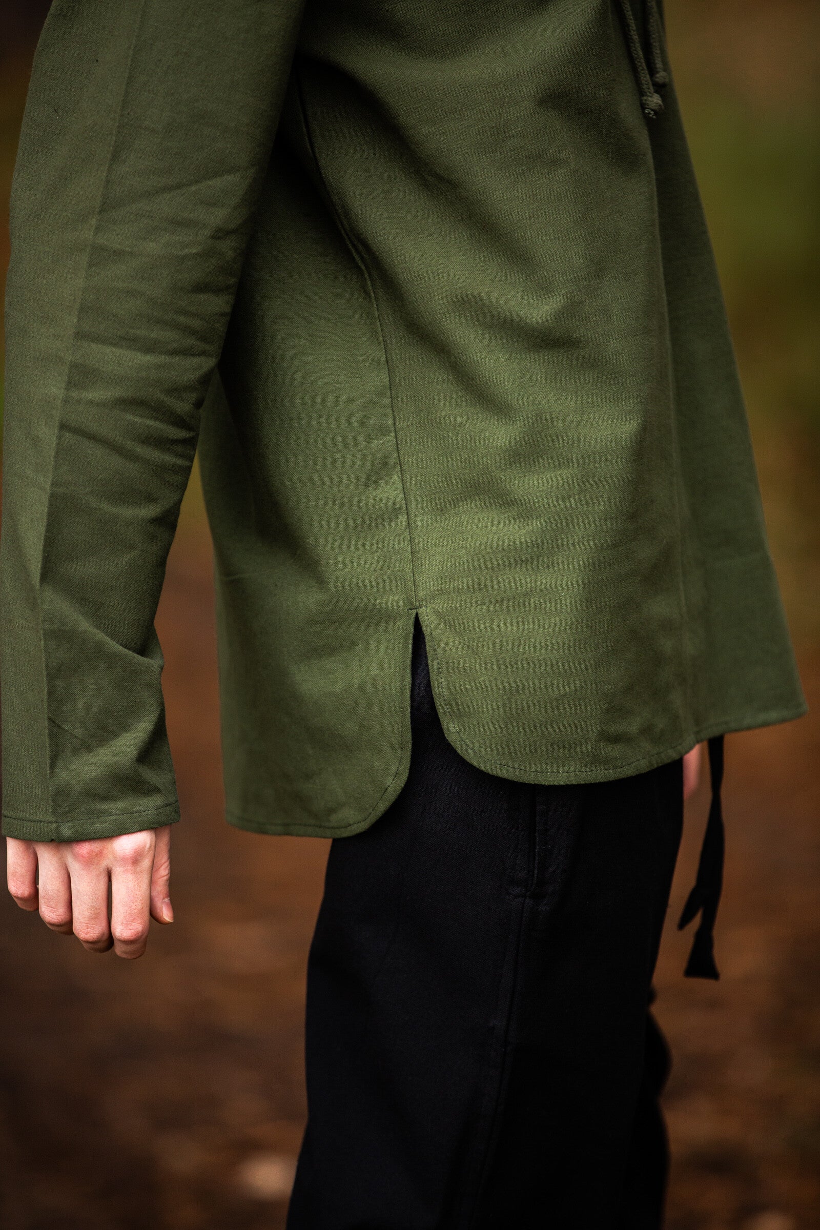 Der leicht geschwungene Saum erinnert an historische Schnitte – unaufdringlich und doch wirkungsvoll. Hemden wie dieses waren einst alltägliche Begleiter von Handwerkern, Reisenden und Kriegern. Sie verbanden Funktionalität mit dem Ausdruck von Standhaftigkeit und Charakter.
